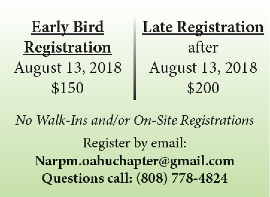 Visit www.oahu.narpm.org for a registration form. For inquiries, email narpm.oahuchapter@gmail.com, or call (808) 778-4824. Advance reservations are required. We will not be accepting walk-ins and/or on-site registrations. The seminar has sold out in the past, so register early! We hope to see you there!