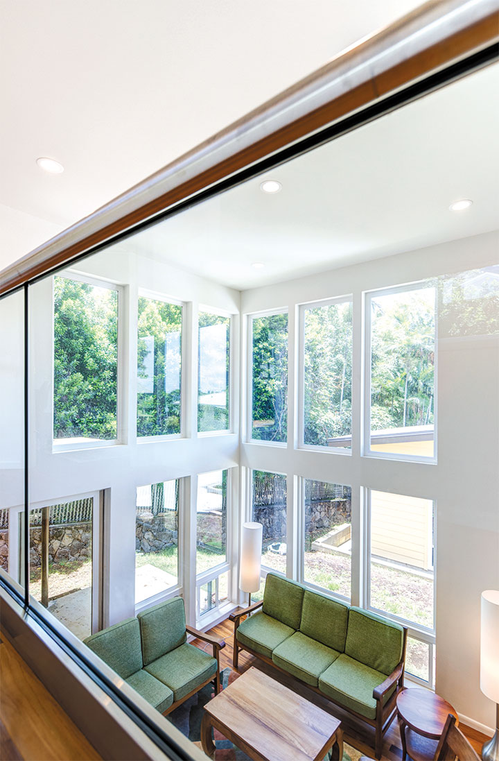 “One of our clients was determined to bring the outdoors into his rebuilt Manoa home,” recalled Fujimoto. “We designed his living room with glass windows running along two walls. Even the second-floor rail was made of glass, allowing the lush outdoors to be enjoyed on both levels of the home.”