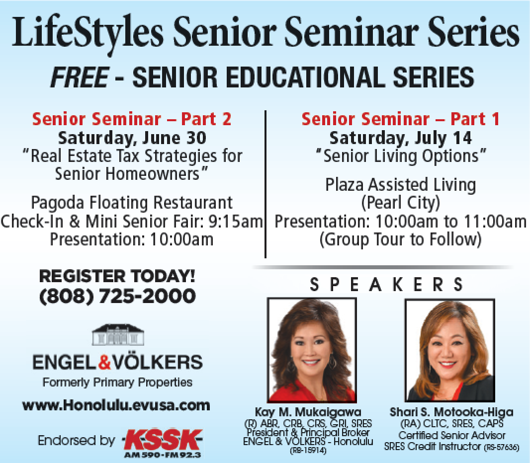 Join Kay Mukaigawa and Shari Motooka-Higa for an informative free session on real estate strategies for senior homeowners. Prior to making any decisions, it is strongly recommended that readers consult appropriate experts and licensed professionals for any legal, tax, and accounting advice to determine how this information may apply to their particular circumstances.