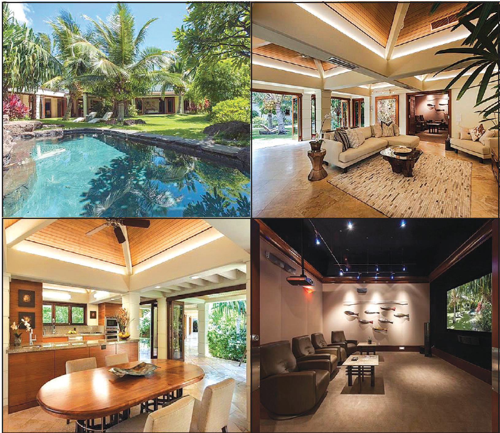 With 3,747 square feet of interior living space augmented by 1,510 square feet of lanai area, the home includes three bedrooms, four-and-a-half baths, a main living/dining area that flows to the open kitchen, family room, office, and media room. The media room is essentially a soundproofed home theater with state-of-the art equipment and lounge chairs.