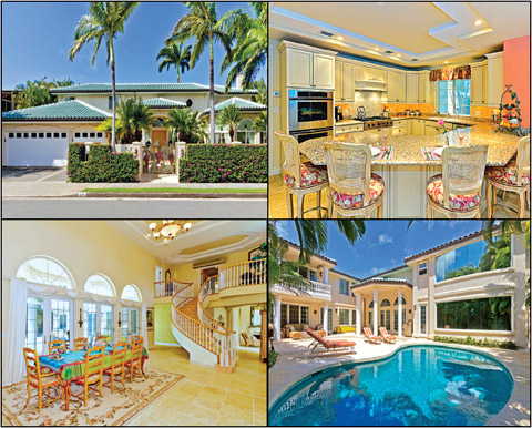 The 4,660 square foot, two story home embraces an interior courtyard, a large, tiled swimming pool with a decorative hibiscus mosaic at the bottom, and several covered and uncovered areas for outdoor dining and entertaining. Most major living spaces overlook this private, oasis-like area which is surrounded by palms and lush tropical landscaping. Decks and patios add approximately 600 square feet of usable space.