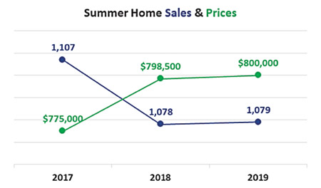 Single-family home sales ended summer 2019 with 1,079 sales — one more than the previous year, but 28 less than summer of 2017. The island-wide median single-family home sales price rose by only $1,500 to reach $800,000, compared to an increase of $23,500 from the same period in 2017 to 2018.