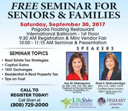 Join Kay Mukaigawa and Shari Motooka-Higa for an informative free session on real estate strategies for senior homeowners. Prior to making any decisions, it is strongly recommended that readers consult appropriate experts and licensed professionals for any legal, tax, and accounting advice to determine how this information may apply to their particular circumstances.