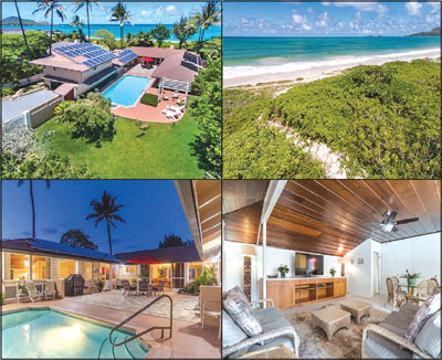A classic, Kailua beach estate with a land area of 22,617 square feet and 97 linear feet of ocean frontage has been listed by Realtor Rita Wong of Rita Wong Realty at $8,588,000. Located on Kai Nani Place, in one of Kailua’s older, established neighborhoods, the spacious four bedroom, three bath main home with 4,212 interior square feet is augmented by a patio and courtyard with a total of 1,858 square feet. Most main living areas overlook spectacular views of the picturesque bay, offshore islands, and coast-line. A permitted guest house on the property provides an additional bedroom, full bath, and kitchen.