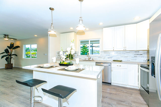Creamy white quartz countertops give this kitchen a prized hygienic look — both functional and beautiful. Indeed this brand new Kailua home, built in 2020, includes an attached legal ADU unit, making social distancing with extended family doable and safe. This multi-generational home has three beds and one bath on the first level, four beds and two baths on the second level, and two beds and one bath in the ADU. Listed for $1,598,000 by eXp Realty.
