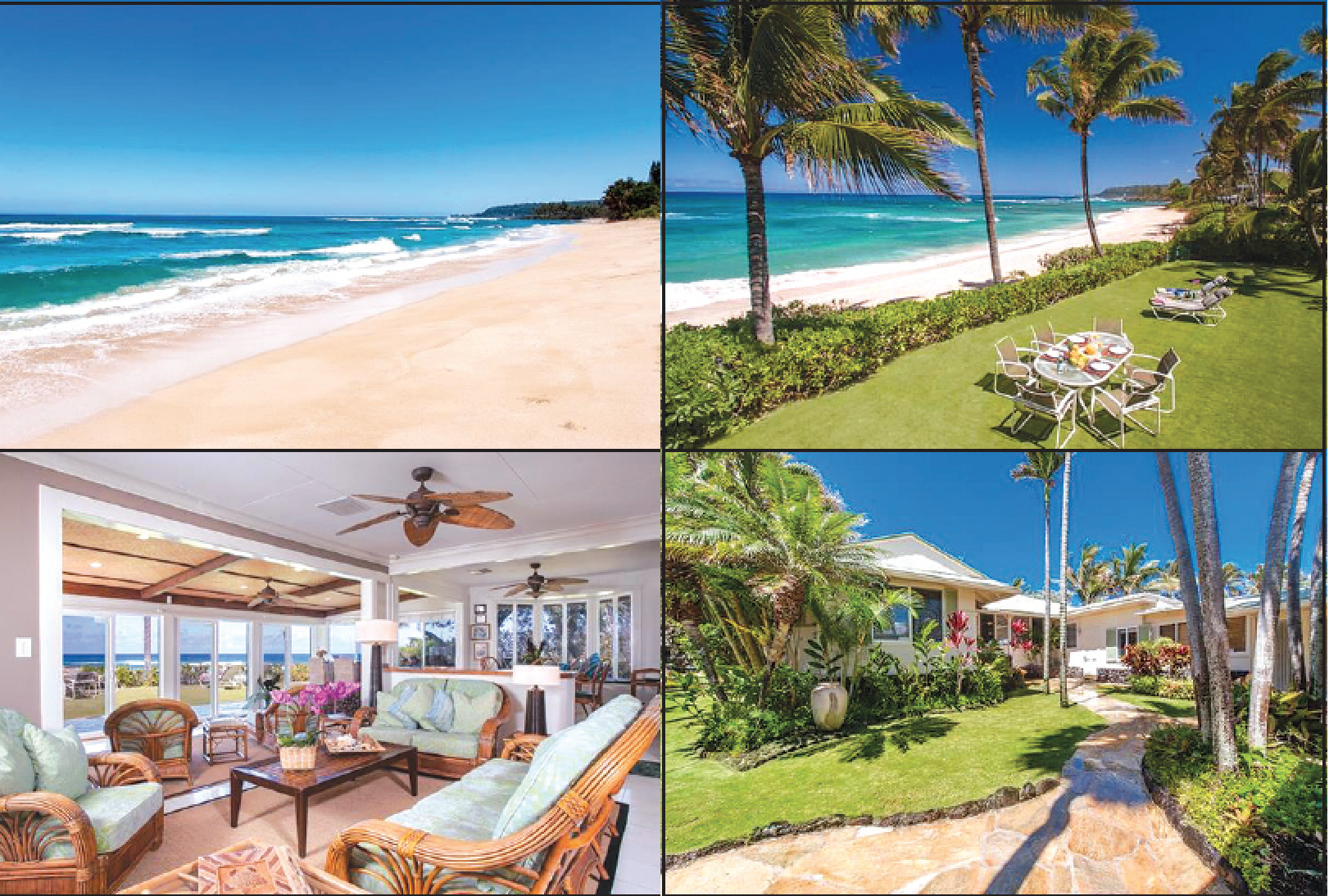 “The property we are listing on Papailoa Beach was named ‘Seaside’ by its owners who have enjoyed it over the years for family vacations,” Allen said. “It is truly the ultimate beach house with its open design, ocean views from all major living areas, and spacious 3,500-square-foot interior with two distinct living spaces including five bedrooms, all on one interconnected single level. From the living room and dining area you look out through windows on three sides to the beautifully kept gardens, the beach, surf breaking on the reef, often with surfers riding the waves, and of course the spectacular sunsets the North Shore is known for.”