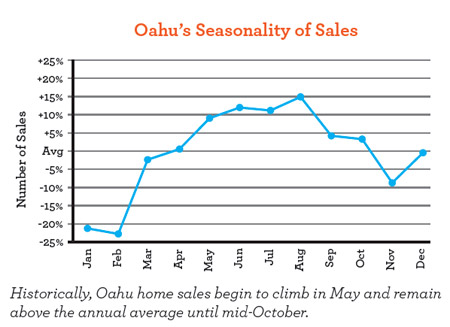Days on Market — the number of days a home is on market before an offer is accepted — typically fall below the annual average from April to mid-September. Oahu homes sell faster in June than any other month, when Days on Market are 10 percent lower than average. Sellers will want to position their homes to sell within this time period.