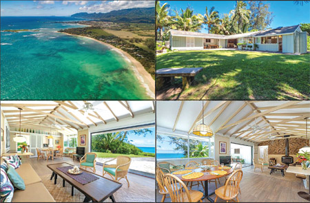 Coldwell Banker Pacific Properties Realtors John Peterson and Maggie Walker have co-listed a Malaekahana home on an acre-plus lot with 107 linear feet of beach frontage that they describe as “one of the best locations on Malaekahana Bay.” With nearly 1,300 interior square feet, three bedrooms, and two baths, the home is surrounded by mature vegetation, including palms and ironwoods. A covered veranda looks out to the ocean across a grassy lawn.