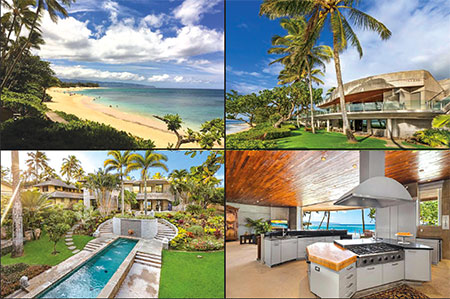 The home includes four bedrooms, six full baths and two half-baths, a “dream kitchen” with adjoining caterer’s service kitchen, a library with floor-to-ceiling teak shelves, an office with numerous built-ins, leisure and wellness rooms with a deep soaking tub, massage and yoga stations, a master-suite “sanctuary,” an elevator connecting the ground level with the main floor, luxury finishes and high-end detailing throughout. Floor-to-ceiling sliding glass doors showcase the panoramic ocean views and year-round sunsets.
