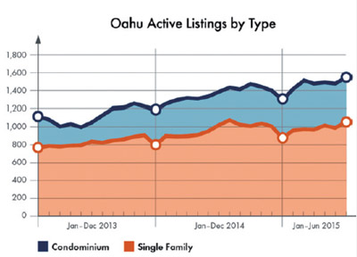 The increase in median SFH and condo prices on Oahu does not mean affordable homes have disappeared, only shifted locations. The inventory of SFHs has steadily increased since January 2013. As of June this year, the number of available single family homes (1,041) matches the highest it’s been in the past three years, with the exception of July 2014 (1,064). The growth shows no sign of stopping in 2015, as inventory for SFHs has grown 9 percent overall in Oahu this year from April to June.