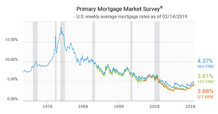 According to Freddie Mac, for the past 50 years, 30-year fixed-rate mortgage rates first dropped below 5 percent in April 2009. In October 2011, the average rates fell below 4 percent. But rates started rising in 2018, and the U.S. weekly average for a 30-year mortgage reached 4.94 percent for two consecutive weeks in mid-November — the highest in seven years. The U.S. weekly average 30-year-fixed rate mortgage as of Feb. 14 was 4.37 percent, down slightly.