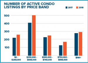 The number of condos for sale is up across all price bands, but with more than 500 available units priced between $250,000 and $499,000, this is the “sweet spot” for many would-be condo owners.